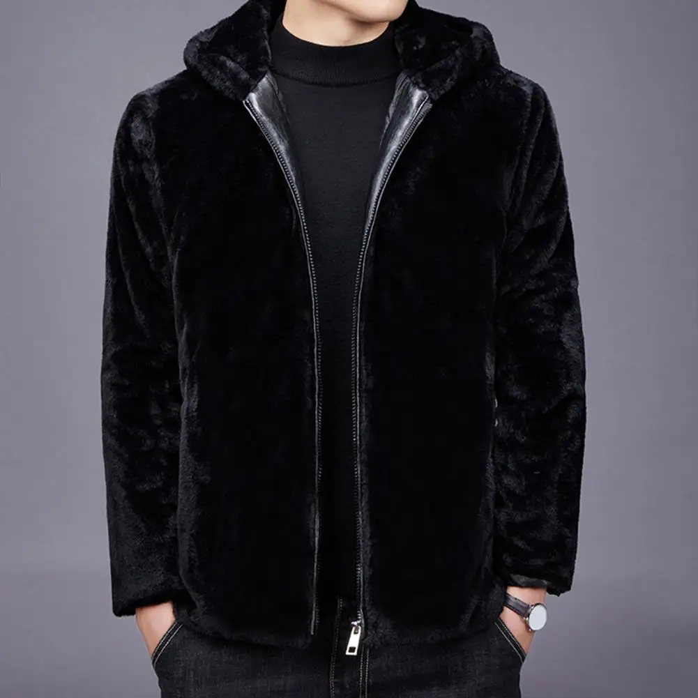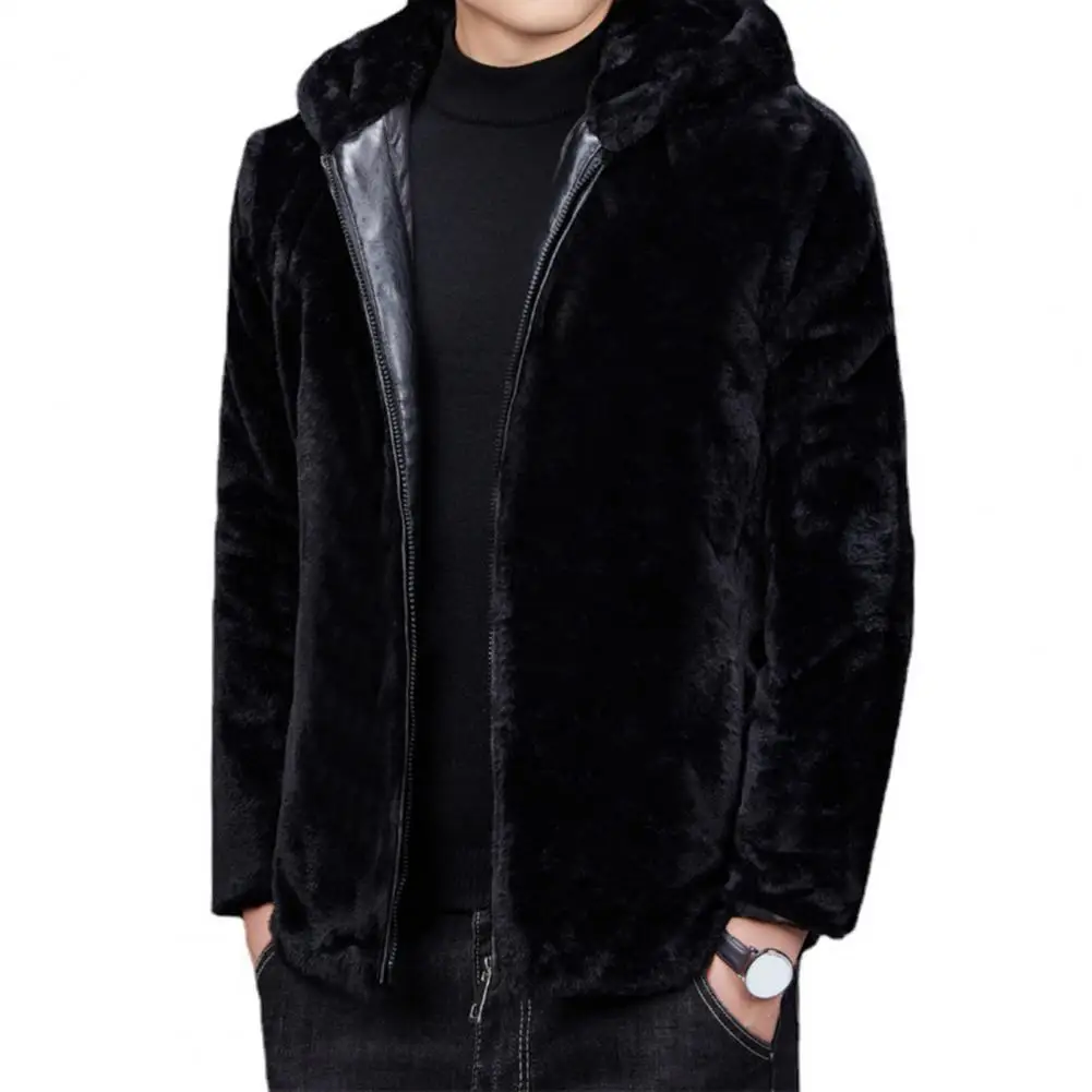 Chaqueta de hombre con capucha, manga larga, imitación de piel de visón, bolsillos, cremallera y forro polar grueso para el invierno