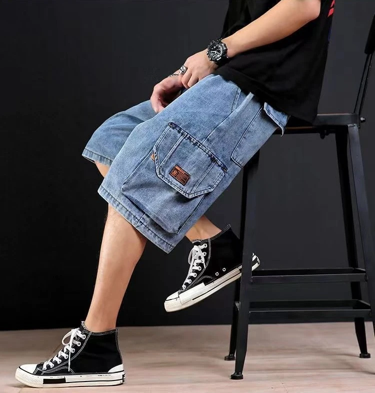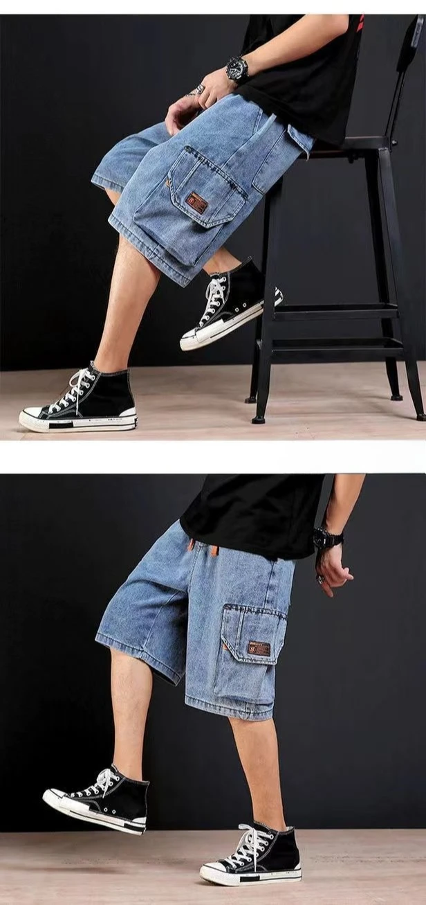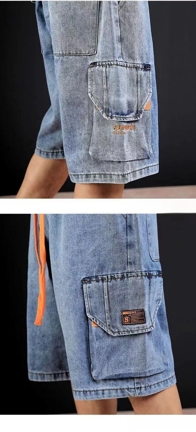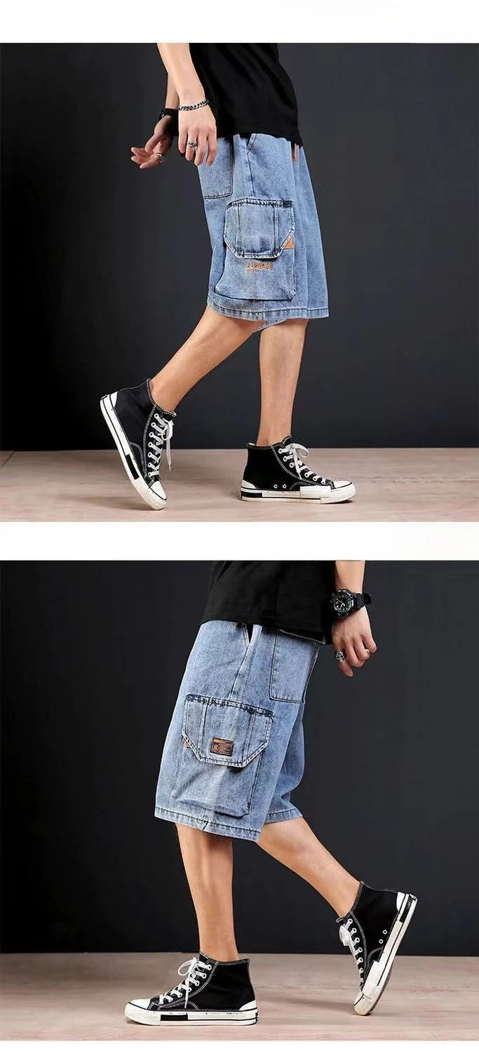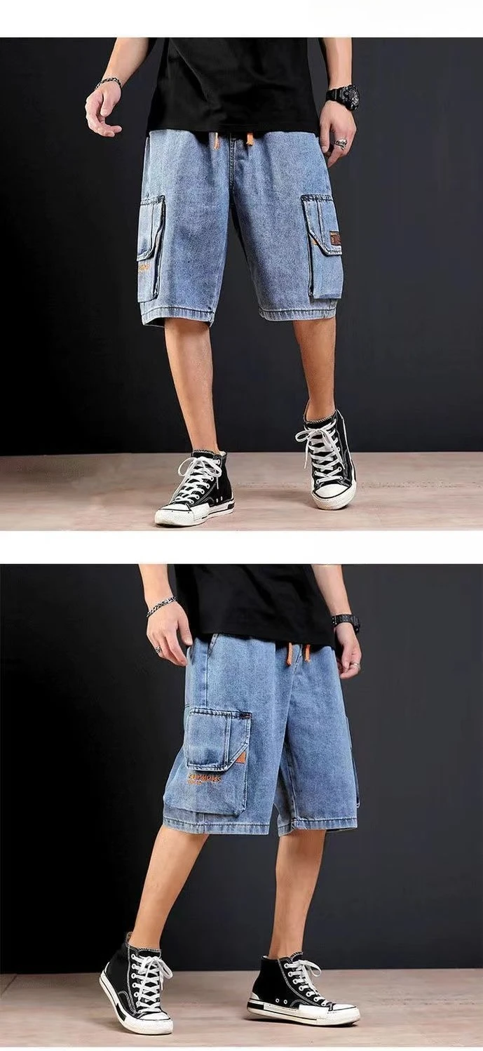 Pantalones cortos de mezclilla para hombre, rectos, holgados con texto, pantalones vaqueros cortos sueltos para hombre, venta de verano, pantalones finos para hombre, pantalones vaqueros masculinos con cintura elástica